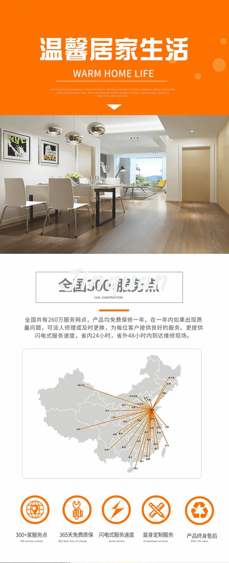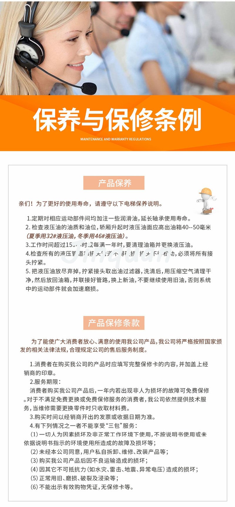 家用電梯,提供十二個月的質(zhì)保期。在質(zhì)保期內(nèi),如電梯出現(xiàn)故障,我們的專業(yè)維保人員會在二十四小時內(nèi)趕到現(xiàn)場,免費進(jìn)行維修保養(yǎng)。質(zhì)保期外或質(zhì)保期內(nèi)屬人為操作不當(dāng)導(dǎo)致的故障,我們也將在二十四小時內(nèi)趕到現(xiàn)場,我們僅僅收取一點適當(dāng)?shù)某杀举M。