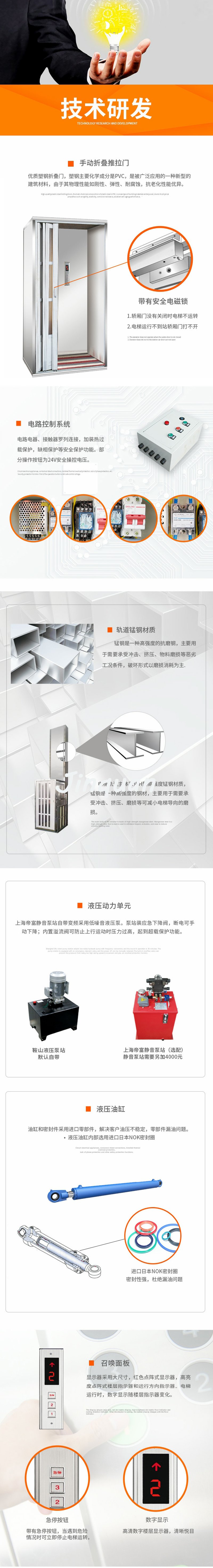 家用電梯采用液壓傳動,所以運行非常平穩(wěn)。其液壓系統(tǒng)攜帶防爆閥,故障時可控制下降速度;另外,采用高強度鏈條牽引電梯上下,另附加鋼絲繩防止墜落,從而保證電梯的安全運行。
