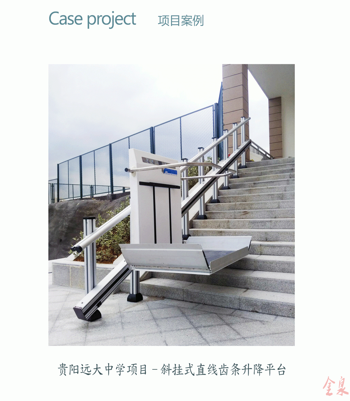 傾斜式無障礙升降平臺可安裝在室內(nèi)和室外,可安裝在大型公共場所,如療養(yǎng)院,學(xué)校,餐廳,酒店,機(jī)場,地鐵,商場等。我們的斜掛式無障礙升降機(jī)平臺使用根據(jù)樓梯形狀設(shè)計的高精度導(dǎo)軌,可應(yīng)用于直線,弧形,螺旋形樓梯。